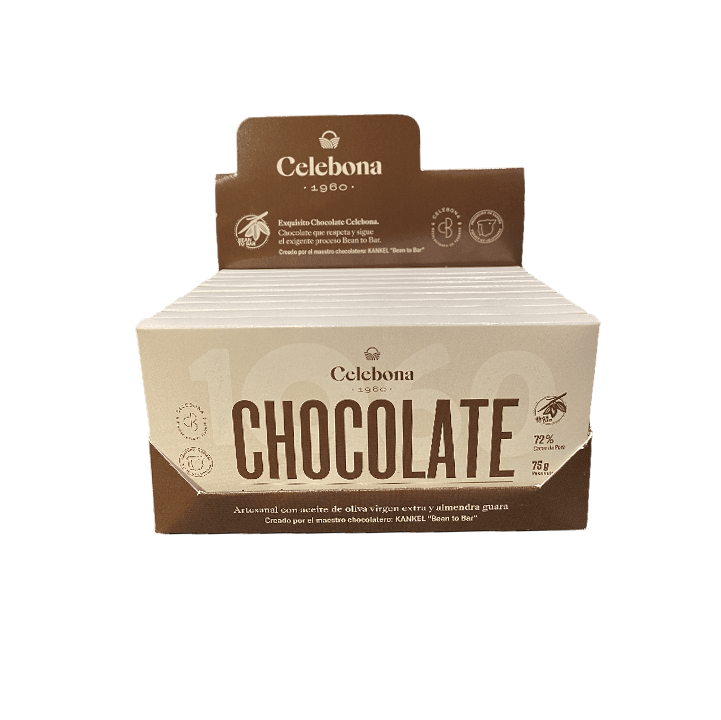 Chocolate artesanal con aceite de oliva virgen extra de Celebona, almendra Guara y cacao de San Martín, Perú.