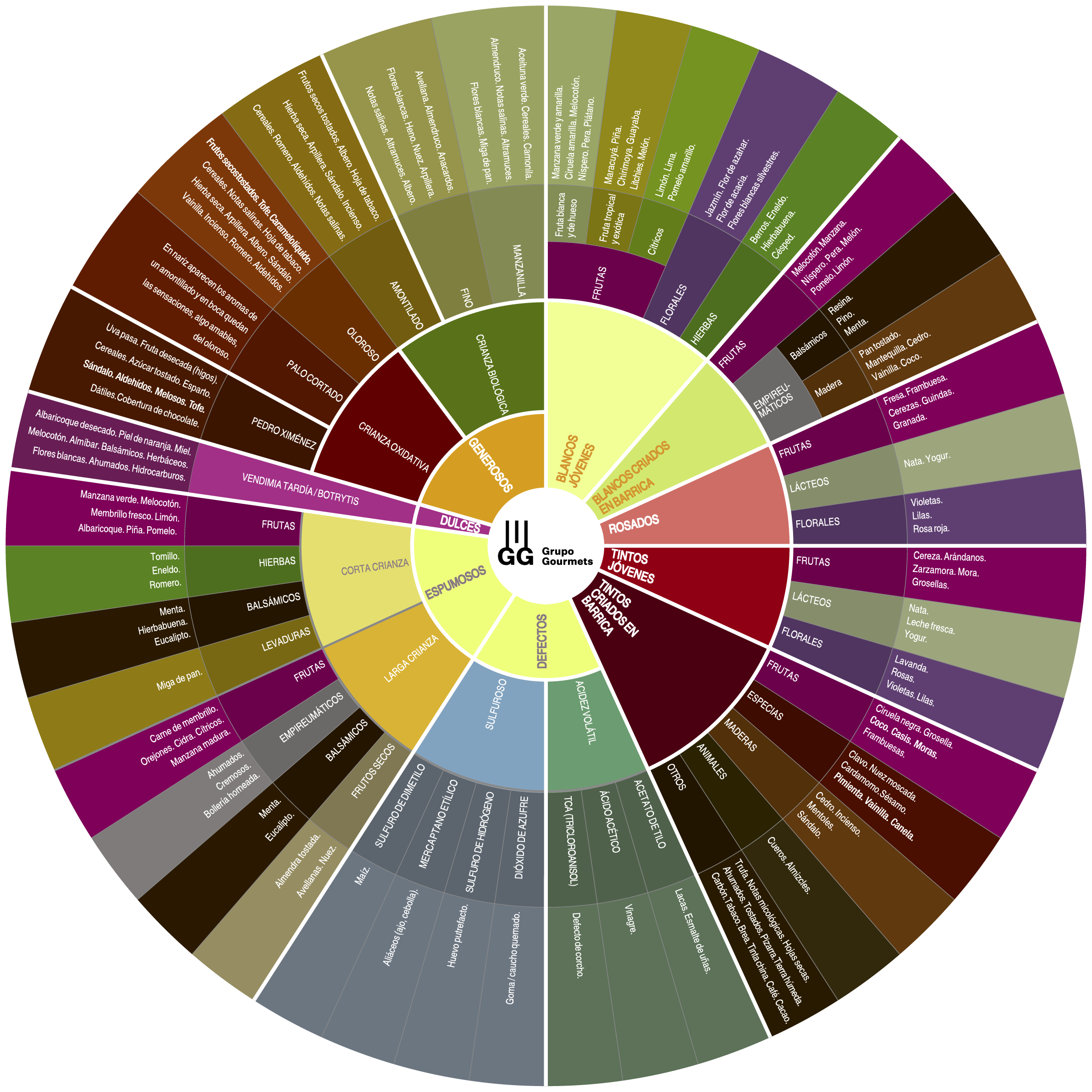 En la rueda aromática que incluimos a continuación, podrá encontrar algunas de las percepciones generales que se pueden apreciar en los distintos tipos de vinos que se elaboran tanto en España como fuera de nuestras fronteras.