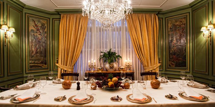 Brilla la vajilla de diseño exclusivo, la cubertería con baño de plata y el fino cristal de las copas sobre las mesas vestidas con manteles recién planchados.