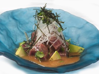 Tiradito nikkei (con atún, soja y rocoto), causa limeña (con patata morada, cangrejo, aguacate y huancaína)... Pisco sour o chiclano o “El Sueño de Ica” con pisco, zumo de manzana y lima. ¿Tiradito del amor (con gamba roja, buey de mar y coral)?