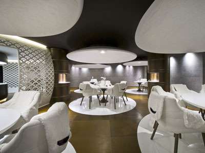 Otro dos estrellas, Le 1947, con la cocina moderna e imaginativa de Yannick Alléno. El restaurante, a pie de pista, es como una nave espacial con tan solo 5 mesas para disfrutar con los cinco sentidos (290-390 €).