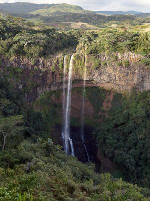 La excursión pasa cerca de la cascada de Chamarel, que salta 83 metros en un acantilado abierto en el bosque, antes de llegar al mirador sobre los barrancos del Black River Gorges National Park.