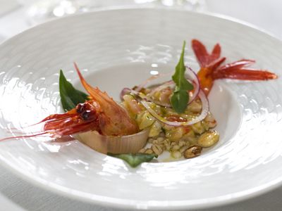El concepto fresco, el valor del territorio y el producto. Lo que intentamos es fusionar. ¿Cómo podemos dar la visión de un producto típico gallego llevado a otra cosa? El ravioli de grelo relleno de lacón. Hemos logrado el cocido cúbico, para disfrutarlo y poder seguir comiendo. El risotto, que no se usa mucho aquí, funciona muy bien como acompañamiento de un pescado.