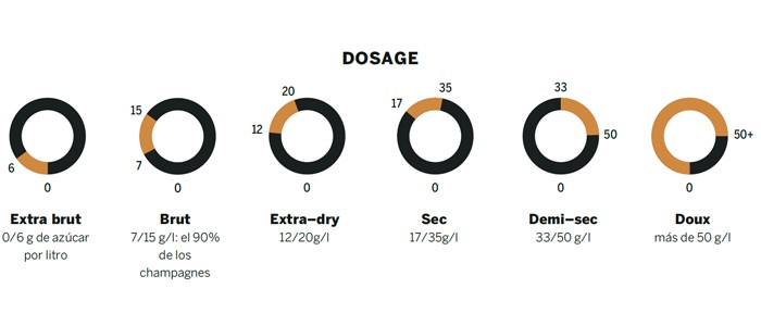 En cuanto a siglas o indicaciones, un repaso a las habituales. Blanc de blancs: sólo hay chardonnay en la elaboración. Blanc de noirs: pinot, noir o meunier. Rosé: rosado de saignée (uvas negras enteras maceran hasta obtener el color) o, excepción solamente permitida en Champagne, ensamblado de un vino tinto, vinificado en Champagne, en la cuba de jugo blanco.