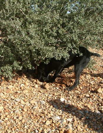 Los cerdos –las hembras son mejores buscadoras– presentan tres inconvenientes: entrenados desde pequeños dándoles trocitos de trufa, estos animales voraces se vuelven adictos: buscan, encuentran y si el amo no está al tanto, devoran la pieza en un santiamén; otro problema es puramente táctico, porque para una actividad que se pretende ocultar no conviene pasearse por el bosque con un cerdo, y el tercero, que en España sólo está permitido ‘cazar’ trufas con perro, en temporada (del 1 de diciembre al 15 de marzo siguiente), llevar por todo arma el machete trufero y la obligación de rellenar el hueco de donde se ha extraído la pieza, detalle éste que se ha cumplido siempre, sin necesidad de leyes impositivas: cualquier buscador procura borrar toda huella del escondite de su tesoro.