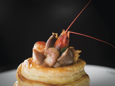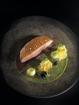Su cocina en Taillevent oscila entre los canelones de hierbas del huerto con broccio corso al tournedo Rossini con patatas Anna, de las vieiras con manzana y sidra o la lubina de anzuelo a la Dugléré a la empanada hojaldrada de molleja de ternera y cangrejo de río salsa Nantua o el rodaballo con leche de coco y curry...