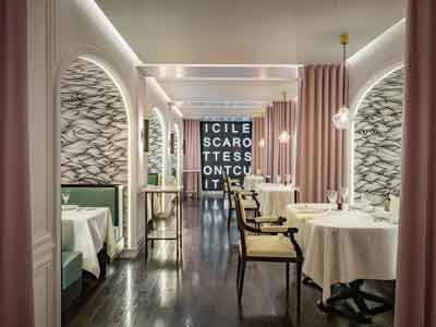 Copas de Zalto, platería de orfebre (Pierre Meurgey), vajilla de Hering, Jars, Reynaud. Abierto cada día, de 8 de la mañana a medianoche, con desayuno y merienda.