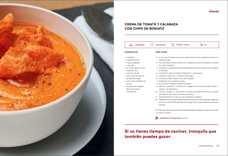 El libro recoge recetas divididas en verduras, pescados y mariscos y carnes, un práctico calendario de productos de temporada y una completa explicación sobre la variedad de tomates, aplicaciones e ingredientes que Orlando tiene en el mercado: Clásico -tradicional, equilibrado y manteniendo la receta original de 1968-, Aceite de Oliva -aromático y fresco-, Estilo Casero -con trocitos de cebolla y tomate-, Artesano –con una textura más concentrada y sabor más intenso-, Ecológico - delicado y placentero- y 0,0 - sin sal ni azúcares añadidos.