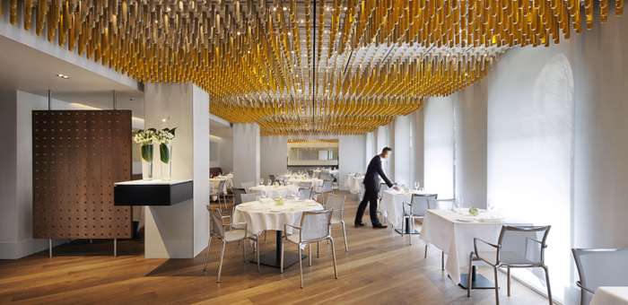 El comedor cuenta con un espectacular techo con 7.660 tubos de especias creado por David Rogers, en recuerdo a la despensa de especias de Donosti. En el plato, la personalidad de los Arzak adaptada a la metrópoli, como comenta Elena: “El hotel, al igual que nosotros, pretende que tenga su propio estilo. Hay platos que en San Sebastián podrían tener mucho sentido y en Londres ninguno”.