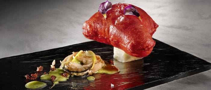 También nos permite aprovechar partes de verduras o vegetales que antes no usábamos, como ciertas hojas de las escarolas, tallos de puerros, hojas verdes de la col, consideradas más amargas, pero con una potencia de sabor infrautilizada que resulta interesante para nuevas elaboraciones. Con la biodinámica no solo son comestibles sino que tienen un sabor especial”. Un plato: acelgas moradas, rojas, amarillas y verdes con gran sabor mineral, de tierra, con un tomate recuperado, con menos líquido que el habitual y con un punto de acidez muy bueno, todo biodinámico, con gamba y pan crujiente. “El producto es la esencia del plato y si no tenemos la capacidad de avanzar en él, no podemos ir más allá”, puntualiza.