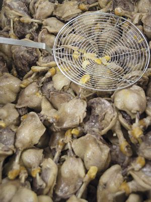 A los patos no se los puede cebar en lugar cerrado por la temperatura que generan: “consumen tanto oxígeno como un caballo al galope”. Por eso mismo, se les pulveriza agua para refrescarlos mientras comen. Hay que protegerlos de los zorros, esos gourmets que sólo comen las cabezas. Dos semanas antes de comenzar el cebado se les prepara el buche y las dos últimas las pasan al aire libre. A más plumas, mejor foie-gras. Tras el desplumado, los especialistas compran el plumaje. El muslo confitado pierde la mitad de su peso durante la cocción. Y, dos datos de Loïc Poustis, de exportación Lafitte: