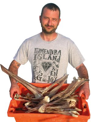 David recuerda aquellos momentos de su infancia, cuando salía a pescar con volatín con la barca de su abuelo, que enganchaba el pescado de unas cañas para secarlo. Así colgado, los gatos no podían alcanzarlo, pero el nieto siempre se las ingeniaba para sisarlo. Al cabo del tiempo, aquel niño –hoy con 38 años– vive de la pesca. Las especies que más captura son cabracho, dentón y serviola, además de raya, que también sirve sin desmigar a los restaurantes de la pequeña pitiusa, y langosta, crustáceo a cuya pesca dedica los meses de verano.