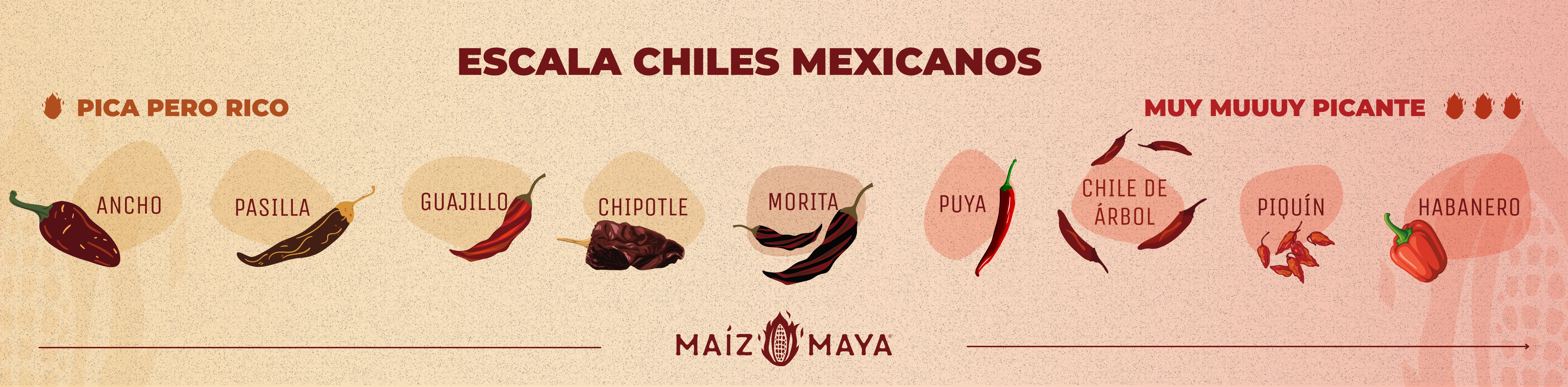 Maíz Maya, empresa especializada en productos mexicanos de maíz, se ha propuesto democratizar el conocimiento sobre los chiles mexicanos a través del “Picantómetro” una guía para entender, disfrutar y respetar este ingrediente que va desde el “pica pero rico” hasta el “muy muuuuy picante”. Importante antes de empezar a leer, el nivel de picor se mide por SHU (unidades Scoville), una escala estándar para medir la intensidad de los chiles y salsas, cuanto más alto es el número, más picante es el alimento.