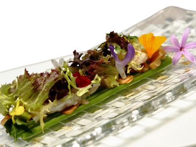 “Elaboramos un menú de tres platos sobre tres modelos suyos, inspirados en sus vestidos. Discutimos de colores, formas, texturas e hicimos un espectáculo en Madrid con tres creaciones suyas y tres platos nuestros. Desfilaban modelos y yo iba sacando los platos. Quedó muy bien. Era primavera/verano, sus modelos eran muy ligeros, muy frescos, mucha gasa y nosotros fuimos por ese camino, utilizamos los aires, la temperatura, muchas cosas que llevan a lo que Juan había dicho con sus creaciones y nosotros con los platos”.