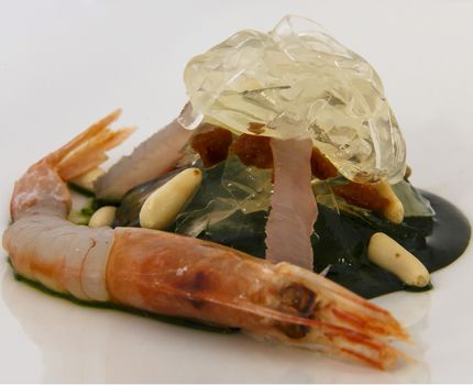 En Abantal, platos muy meditados, estética minimalista, mezcla de elaboraciones, expresionista a veces, nueva cocina andaluza: tallarines de manzanilla sobre crema de algas, gamba blanca de Huelva y albur ahumado, por ejemplo.