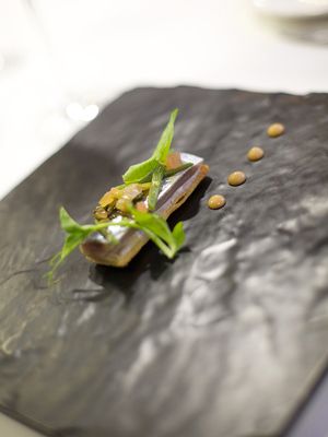 Al mismo tiempo, platos a medio camino, que podrían adaptarse a cualquiera de los dos menús: croqueta de bacalao ahumado con muselina de ajo; ‘dim sum’ de langostino y cerdo con crema de setas, trufa blanca, champiñones laminados y caldo de jamón ibérico (un plato que juega a la ambigüedad, ya que a la vista asemeja oriental, pero resulta familiar al paladar vernáculo); anguila a las tres cocciones (brasa, marinado y vacío con salsa de ostras) acompañada de guiso de níscalos; chipirón en su tinta relleno de ‘blanquet’ (embutido sin sangre); vieira con molleja de ternera y royal de alcachofa, o huevos Sant Celoni, con caviar y puré de coliflor, homenaje a Santi Santamaría. Y otro arroz suculento, el cremoso de setas, panceta y codorniz ahumada, ligado con paté de los higadillos.