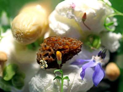 Oído cocinero: el menú que degustaríamos más tarde, invitación de la casa, abría con snacks de erizo, junco marino y sotobosque, quicos y cilantro caramelizados, la reinterpretación de la ensalada Waldorf y crema de calabaza; siguió con un excelso tartar de atún con erizos –dulces protagonistas que encerraban la explosión sápida en minúsculos cristales crujientes de sal–, celebramos la eclosión primaveral con el primer verde, para aterrizar sobre el apoteósico “mar y montaña”: arroz cremoso de erizos y espárragos silvestres; los granos de buen tamaño, con una textura que sobrepasaba el punto al dente pero mantenía la consistencia, estaban henchidos de sabor. Sotto voce, el secreto del chef: arroz italiano de la variedad acquarello.