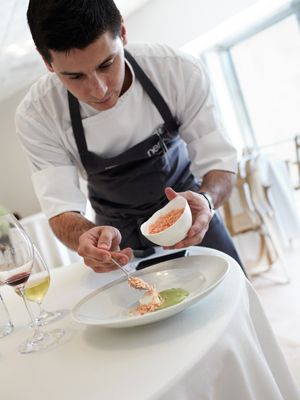 El chef busca “una cocina que emocione y que haga pensar”, pero sin complicarle la vida al huésped. Los sabores son nítidos, reconocibles, y la sorpresa suele darse en las texturas, muchas veces insólitas, y en la combinatoria de sabores. Ménage à trois: aguacate, pomelo y coco; foie-gras, pera e hibisco; rodaballo, nabo y romero; guisante, vainilla y yema de huevo. Orgía: patata, manzana asada, vodka y lima.
