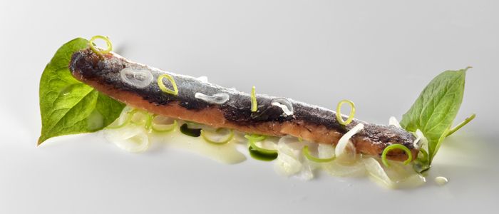 Presentación: Salsear con la aceituna verde. Colocar las anchoas confitadas, con unas gotas de aceite picante y apoyar sobre ellas las cebolletas. Colocar un “bocata” de espinas de anchoa frita. |