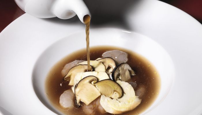 Sobre una quenelle de mayonesa, disponer las quisquillas, las castañas y las setas y acompañar del caldo de champiñones. |