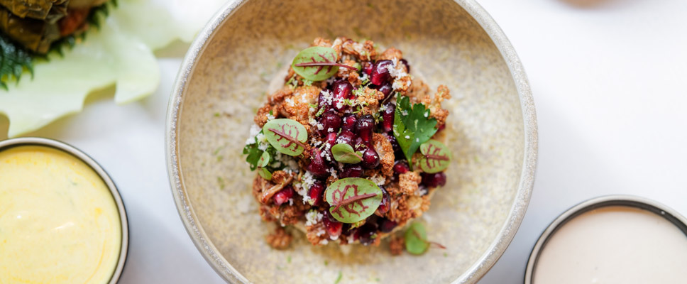Las tapas desterradas por los mezze. Los garbanzos, a través del humus, por primera vez en el idioma de lo actual. Junto a shawarma, zaatar, kebab, pimientos y berenjenas. Aires tradicionales del Líbano y novedosos de Tel Aviv.