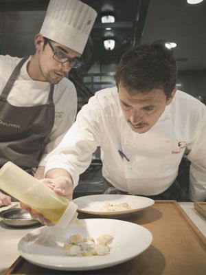¿Escuela o stage? Esta es la otra disyuntiva. Conclusión: ambos escenarios se complementan y valen. Óscar Velasco tiene muy claro que una mayor formación facilita absorber mejor nuevos conocimientos. Muy importante para Francis Paniego (El Portal de Echaurren) fue todo lo que le enseñaron en la escuela mater de Madrid, donde “aprendí lo que sé y fueron los mejores años de mi vida”, dice rememorando al profesor José María Centeno, una institución entre muchos cocineros más, como lo ha sido Luis Irízar.