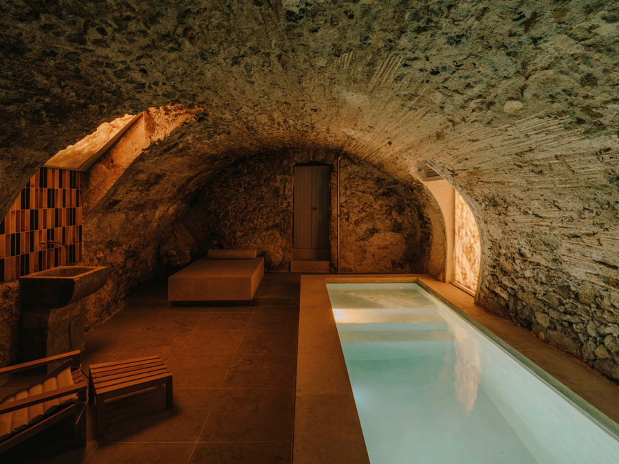 Un espacio para relajarse dentro de la roca calcárea de la muralla romana de Girona. Cuenta con dos zonas, la piscina de agua caliente con una piedra tibia donde estirarse y la zona de masajes y tratamientos, diseñada para ofrecer una atmosfera de relajación y tranquilidad.