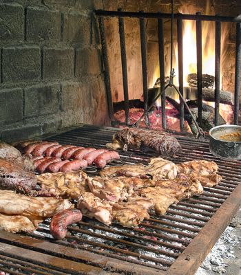 Si España está en el origen y la historia de Uruguay, también han dejado huella portugueses y británicos, y las emigraciones más recientes de españoles e italianos. Todos están presentes en la gastronomía uruguaya, dominada por dos productos, el ganado vacuno y la pasta. El país produce una de las mejores carnes del mundo, de animales criados al aire libre con pastos naturales, que se prepara en parrillada, uniendo al asado los chorizos, morcillas, chinchulines, riñones y mollejas. El asado se realiza siempre sobre brasas de leña, y puede ser de tira (con hueso), o pulpa, (sin hueso). Según el gusto puede cocinarse jugosa, a punto o cocida.