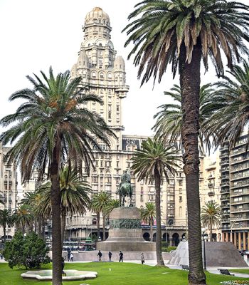 Montevideo es la capital, fundada muy tarde por los españoles, que levantaron la Ciudad Vieja a partir de 1724. Su edificio valioso más antiguo es la catedral, neoclásica, de 1790. A partir de 1833 se traza la Ciudad Nueva, de calles anchas y arboladas, junto a la Vieja. Ambas se unen en la plaza Independencia, donde coinciden la puerta de la Ciudadela, del siglo XVIII, la estatua de Artigas, padre de la independencia uruguaya, el metropolitano palacio Salvo y la Casa de Gobierno, junto al espectacular Teatro Solís, el principal escenario artístico del país.