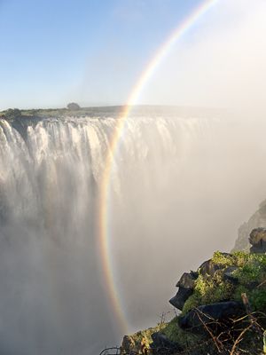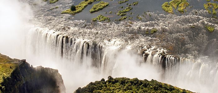 El gran salto de agua era desconocido para el mundo cuando lo halló Livingstone hace sólo 159 años, y ahora ha sido elegido entre las Siete Maravillas naturales del Mundo. A la belleza de las cascadas hay que añadir el atractivo de un entorno salvaje de gran pureza, con las riberas del río Zambeze y sus afluentes cubiertas por una selva frondosa que se diluye en bosques y sabanas donde es posible encontrarse con la gran fauna africana, hipopótamos, elefantes y búfalos y grandes predadores en su habitat genuino. La orilla izquierda del Zambeze pertenece a Zambia y la derecha a Zimbabue, ambas ocupadas por parques nacionales en los que es posible sentirse intrusos en un paraíso ecológico.