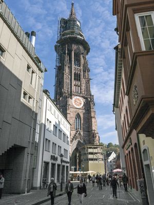 Desde St. Märgen hay vistas extensas sobre los valles que bajan hasta Friburgo, la gran ciudad a orillas del Rin, que es la otra puerta de la Selva Negra. Friburgo tiene una catedral gótica extraordinaria, y un casco antiguo animado por la presencia de 24.000 estudiantes. Es también la capital del vino, reuniendo a treinta cooperativas de la orilla alemana del Rin, donde elaboran buenos vinos de riesling, de chardonnay y de gutedel, la uva local. Es imprescindible visitar la Alte Wache, la casa de los vinos de Baden, una tienda y local de degustación donde se reúnen los aficionados a degustar los vinos de la zona contemplando la formidable catedral. En la misma plaza abre sus puertas el restaurante Oberkirch, uno de los más valiosos de la ciudad, idóneo para degustar la trucha azul, la Forelle Blau de las montañas, o los platos de caza con carnes de corzo o jabalí.