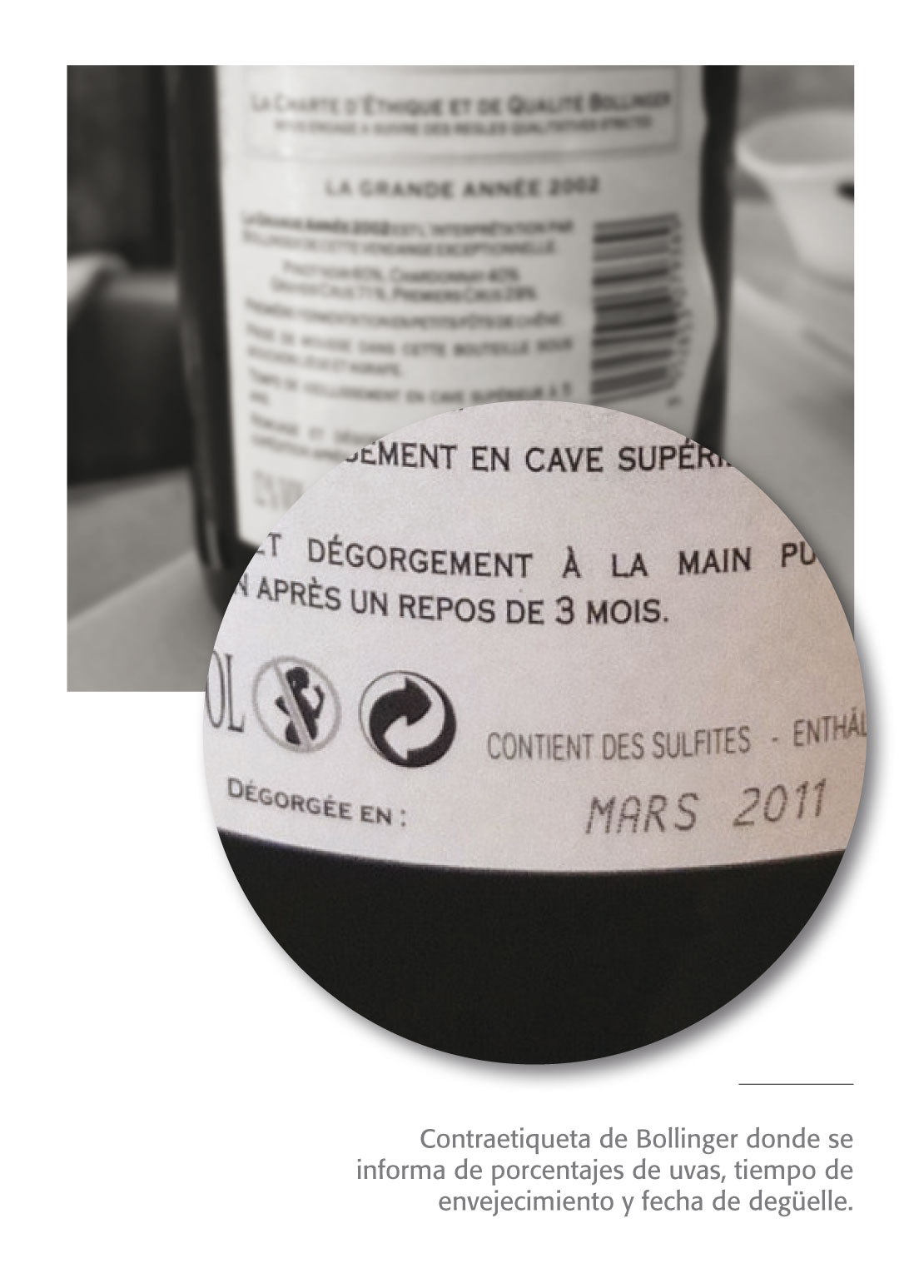 Afortunadamente, algunas casas incluyen es sus botellas referencias esenciales sobre el proceso de elaboración. Es el caso de Bollinger. Al tratarse de un champagne de añada, figura el año 2002: informa sobre los porcentajes de uvas utilizadas y los que proceden de Grands Crus y de Premier Crus, dónde realizó la primera fermentación –en este caso en pequeñas barricas de roble–, el corcho utilizado durante la toma de espuma, el tiempo de envejecimiento, cómo se realizaron el removido y la eliminación de los posos, y el dato de más importancia, la fecha de la eliminación de los posos o dégorgement, noviembre de 2011.