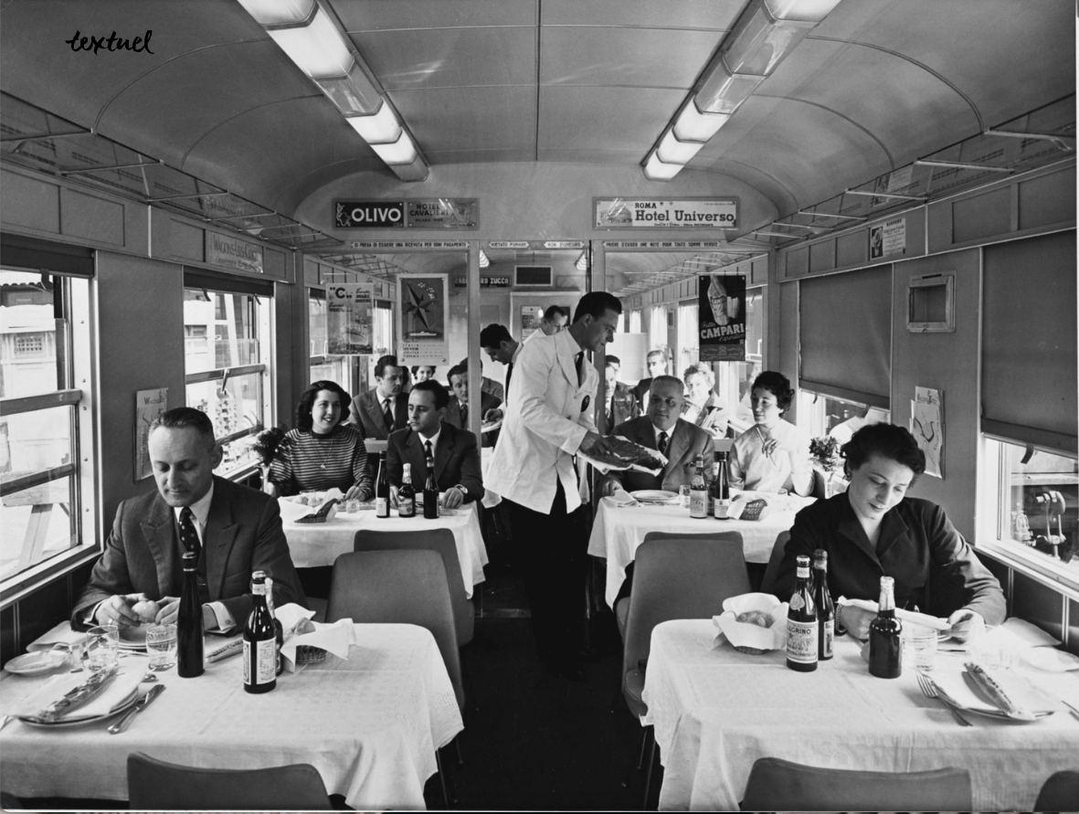 Un álbum de recuerdos repleto de fotografías publicitarias y archivos documentales con los que rememorar el lujo y refinamiento del período de entreguerras, las innovaciones de los años 50 y 60 con sus bandejas de comidas, bares y snacks y los años 70 con la desaparición de la cocina a bordo y la generalización de la venta para llevar.
