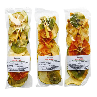 La nueva gama consiste de 5 productos diferentes, cada uno - sin azucar añadido- sin conservantes- sin hornear ni freír- deshidratado muy suave a 42 grados para mantener la mayoría de los propiedades de la fruta.