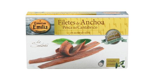 Filetes de anchoa del Cantábrico en aceite de oliva. Serie Oro, marca Emilia. Elaboradas exclusivamente con pesca de primavera. Poseen el sello de C.C. (Calidad Controlada) Anchoa del Cantábrico. Disponemos de formatos especiales para tiendas especializadas y para hostelería.