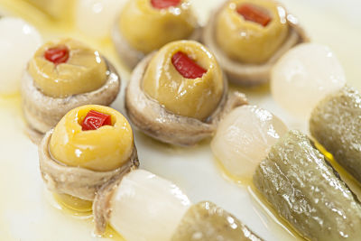 Banderillas de filetes de anchoa enrollados en aceitunas rellenas de pimiento rojo, con pepinillos agridulces y cebolleta en vinagre, todo en aceite de oliva virgen extra