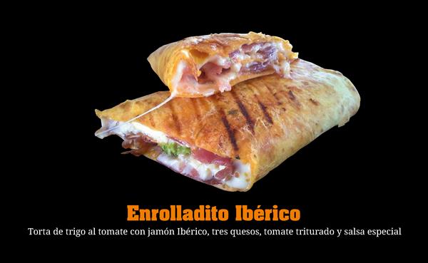 ENROLLADITO IBÉRICO (Torta de trigo al tomate con salsa ibéricoteca, crema de tomate,