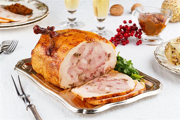 CAPÓN ASADO RELL. CON DÁTILES , JAMÓN SERRANO, MOUSSE DE FOIE DE PATO Y CASTAÑAS + SALSA DE BOLETUS