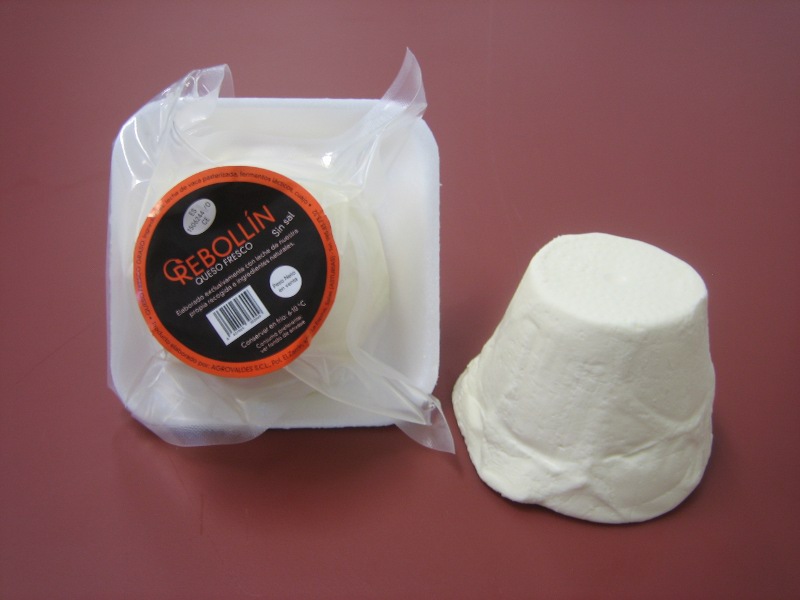El queso fresco Rebollin es un queso elaborado exclusivamente con leche de vaca pasterizada a traves de un proceso natural de coagulación láctica. Es un queso de corteza natural, casi untable y apropiado para la elaboración de postres. El sabor es ligeramente acido, poco o nada salado y cremoso . Resulta pastoso y astringente a su paso por la garganta. Su aroma es suave, caracteristico. Con la adición de leche, azucar y tras batirlo ligeramente, obtenemos un postre lacteo muy cremoso. La adición de leche y azúcar va en función de gustos y la cremosidad deseada. El queso se comercializa envasado en bolsa de plástico al vacio y presentado sobre una bandeja cuadrada, con una caducidad de 2 meses refrigerado.