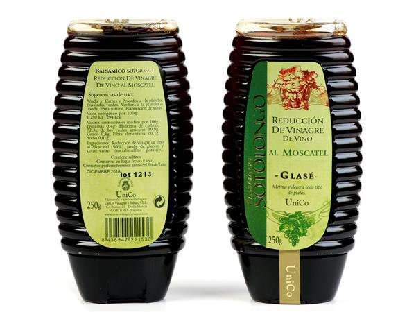 Elaboracion: Su materia base es 100% vinagre al Moscatel. Este se calienta a una determinada temperatura mediante la induccion de vapor hasta que se consigue reducirlo a aproximadamente un tercio de su volumen inicial. Porteriormente se homogeneiza con jarabe de glucosa para evitar su caramelizacion.