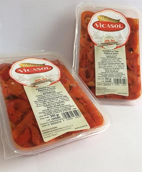 Bandejas de pimientos asados al horno, enteros o en tiras, de un color o mezclando colores, desde 350 g hasta 2,5 kg.