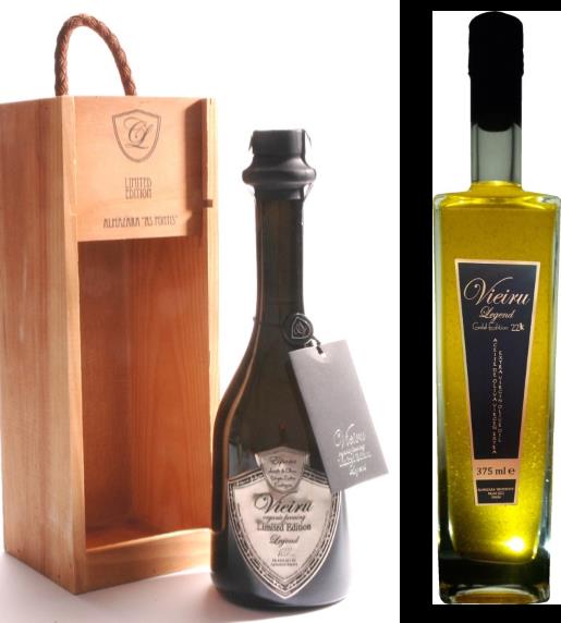 VIEIRU LEGEND GOLD EDITION. Aceite de oliva virgen extra 100% Manzanilla Cacereña con copos de oro comestible de 22 quilates.2º Premio en el II Concurso Producto Innovador de la Feria Internacional de Alimentación – FIAL 2014.