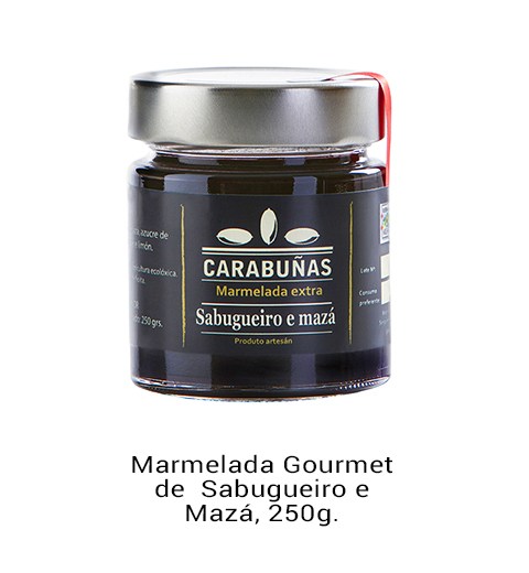 Se elabora a partir de bayas de saúco maduro combinadas con manzanas de producción ecológica gallegas. El resultado es una mermelada suave y dulce pero que se equilibra con el toque ácido de la manzana.