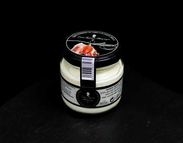 Crema de queso fundido de cabra con jamón ibérico, presentado en tarros de cristal, envasados al vacio, con un peso de 135 grs neto. No necesita refrigeración. Una vez abierto, conservar refrigerado.