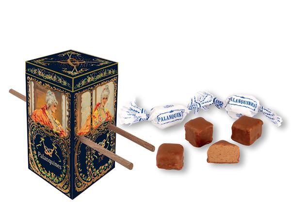 Deliciosos pralinés presentados en un estuche hecho manualmente que recuerda a los antiguos palanquines o sillas.