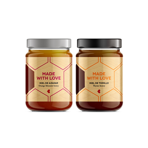 Miel de Azahar y miel de Tomillo 'Made with love' y con etiqueta fabricada en madera natural.