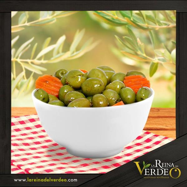 Aceitunas de la variedad hojiblancas, de color verde intenso y aliñadas con las mejores especias y zanahorias encurtidas, resultando un sabor dulce muy agradable, es el acompañante perfecto para tus comidas. "Lo Auténtico te hace Diferente"
