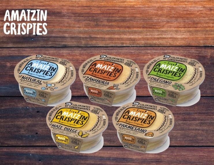 Amaizin Crispies es una versión de la arepa adaptada al tapeo, un producto 100% natural, sin colorantes ni conservantes elaboradas al grill.