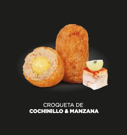 De 35g la unidad, combina tres colores, tres texturas y tres sabores (rebozado, masa y corazón). Masa elaborada con un 27% de carne de cochinillo (pueden apreciarse perfectamente las fibras) y un corazón con un 29% de manzana. Evolución de la receta de cochinillo con manzana.