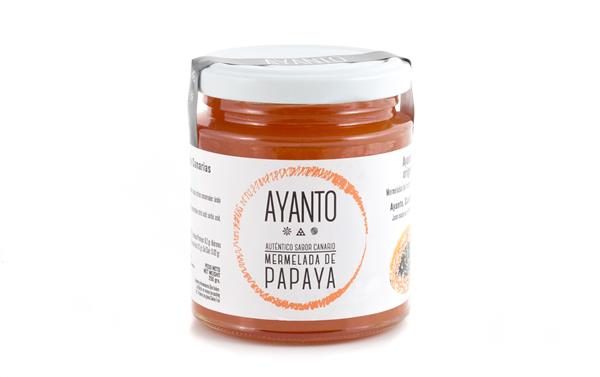 La mermelada de papaya AYANTO conserva el sabor puro de papaya. Con un contenido muy alto de fruto mínimo de 65% de papaya natural de Canarias por 35% de azúcar, que hace que conserve muchos de los propios nutrientes que tiene la fruta como su alto contenido en vitaminas A y C y poco calórica, no llevan ni colorantes, ni aditivos, ni aromas artificiales, el sabor de la fruta madurada en el árbol y recogida a primera hora de la mañana para ser cocinada en unas pocas horas.